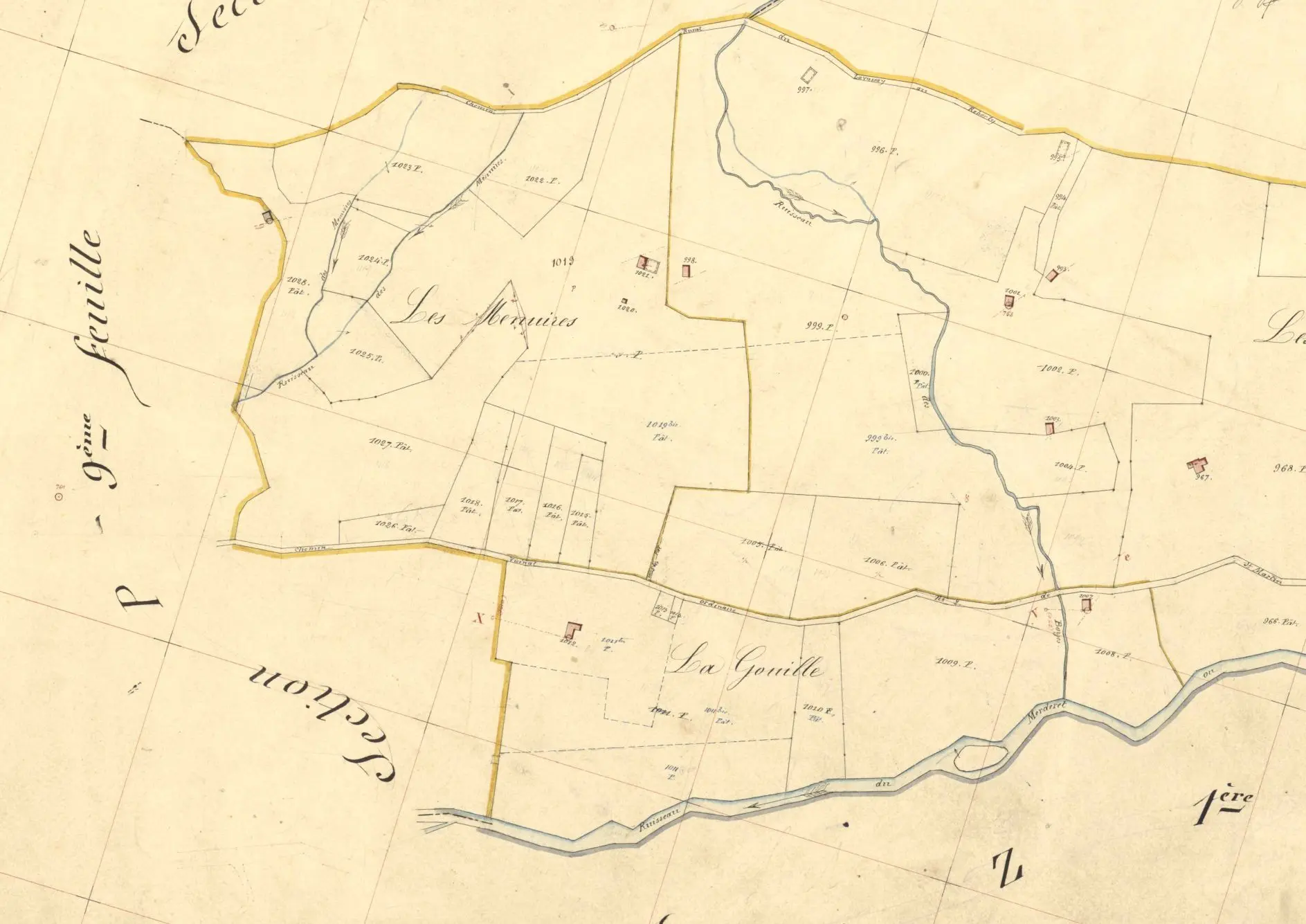 Plan cadastral de 1888 des Menuires en Savoie, montrant parcelles, bâtiments et cours d’eau.